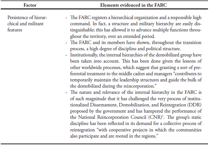 Although the most negative predictions (even after the defeat of the agreement in the plebiscite) have had to be revised, uncertainties persist about the real and total disposition of the FARC to play according to the rules of participatory democracy. These concerns are understandable, in part, because the FARC -a Marxist insurgency, extant after more than fifty years of strife through the development of prosperous, highly criminalized, and enormously profitable clandestine structures- are not strictly enforced (given the State's shortcomings and the impossibility of detailed control) to dismantle these dynamics, behaviors, and structures, even after a relatively formal transition from war to politics (Farah, 2016; Samacá, 2017).