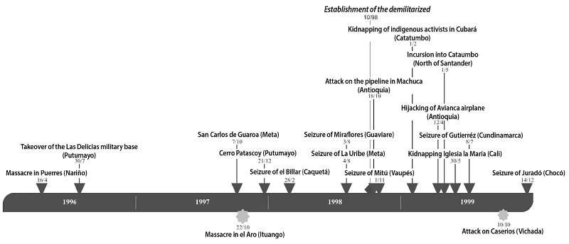 The degradation of the conflict affected the military actions by illegal armed groups in large areas of the national territory. This expansion of their actions unleashed an increasing number of murders, kidnappings, threats, and displacements of the civilian population of urban centers and department capitals (Echandia, 2001). At this point, the geography of violence in the country changed, and a spatial and temporal pattern emerged, manifesting itself in the places where the narratives presented next take place.