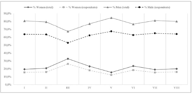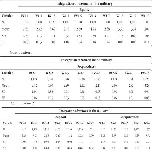 Here, we aimed to determine the advancements in female participation in the ESMIC by measuring the opinions and comportment of the students in four sub-areas: 1) Equity (IW1); Preparedness (IW2); Support (IW3); and Competitiveness (IW4) widely studied by authors such as Herbert (1998); Boldry, Wood and Kashy (2002); Wright (2015); King (2015); MacKenzie (2015); Duncanson and Woodward (2015); Jensen (2016); Segal, Smith, Segal and Canuso (2016); Moore (2017); Dahl, Kotsadam and Rooth (2018); and Wibben (2018).
