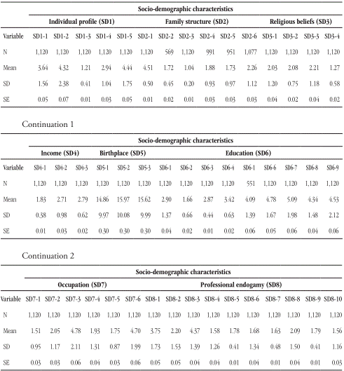 This area collected data on the background of each respondent to determine patterns of thought, feelings, comportment, and geographical origins. It was divided into the following eight sub-areas: 1) Individual profile (coded SD1); 2) Family structure (SD2); 3) Religious beliefs (SD3); 4) Income (SD4); 5) Birthplace (SD5); 6) Education (SD6); 7) Occupation (SD7); and 8) Professional endogamy (SD8). Through 46 questions, such as “What is your ethnicity? (SD1-4)”, “What are your religious beliefs? (SD3-1)”; “What is your family’s gross monthly income? (SD4-2)”; or “What is the highest academic degree achieved by your mother? (SD6-8)” we attempted to establish a feasible basis for understanding tendencies among the students and the potential impact of this information on their social interaction and military career (Table 1).