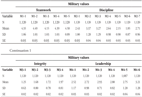 The study gathered information on six areas of interest 1) Socio-demographic characteristics; 2) Professional behavior; 3) Social patterns; 4) Military values; 5) Civil- military relations; and 6) Integration of women in the military. Each area was divided into two or more sub-areas; the sub-areas included two or more questions. Most of the responses were rated on a 5-point Likert-type scale, 1 being, strongly agree, and 5 strongly disagree, while others required an open-end scheme, for example, “What is your place of birth? (SD5-1)”.