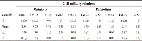 This area was divided into two sub-areas: 1) Opinions and 2) Patriotism, with ten questions such as “What is your mother political tendency? (CM1-2)” or “What is your perception ofpatriotism in Colombia? (CM2-4).” Here, we tried to determine the understanding of civil-military relations, concepts, and characteristics of ESMIC students and their relatives (Table 5).