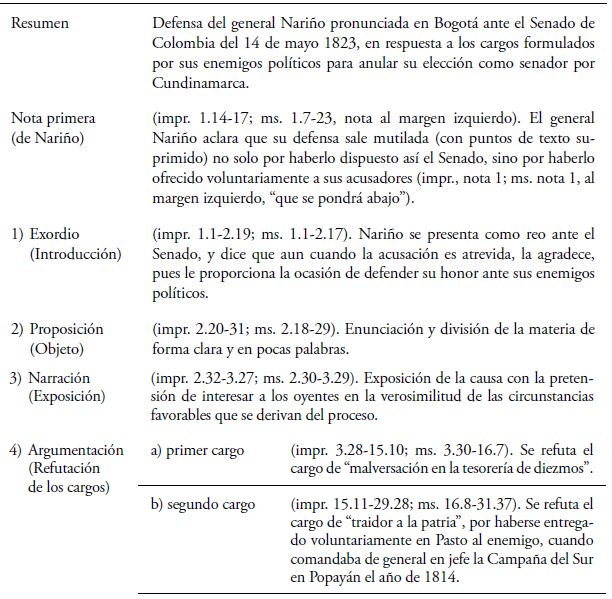 El contenido de la Defensa es como sigue (tabla 1). El resumen informa sobre su carácter judicial como género retórico del discurso persuasivo. El texto comienza con una nota primera de Nariño (que aclara por qué la defensa sale mutilada) y termina con una nota final que hace de las dos Defensas una sola: En defensa de los Derechos del Hombre, suscrita con su abogado Antonio Ricaurte y Rigueiros, y Defensa del general Nariño ante el Senado en 1823. El cuerpo de la Defensa contiene los cinco elementos estructurales de la oratoria forense clásica arriba mencionados.