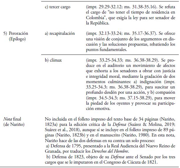 La peroración (impr. 32.13-34.33; ms. 35.17-38-29) o epílogo es la parte patética del discurso forense con que concluye la Defensa. Nariño sigue a los rétores antiguos, distinguiendo en él dos partes, a las que corresponden otras tantas funciones importantes: 1) la recapitulación (impr. 32.13-33.24; ms. 35.17-36.37) o enumeración de los temas tratados, donde sintetiza los argumentos en discusión y las soluciones propuestas con el fin de ofrecer una visión de conjunto de lo dicho para rebatir los puntos fundamentales; 2) el clímax (impr. 33.25-34.33; ms. 36.38-38.29) o movimiento de afectos del auditorio.
