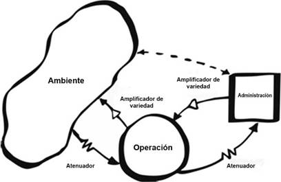 El MSV se fundamenta en las leyes más importantes de la cibernética (retroalimentación y variedad requerida), y sobre esas bases desarrolla un modelo organizacional con altas probabilidades de sobrevivencia y adaptación en un medioambiente cambiante (Brocklesby, 2012). En tal sentido, el MSV analiza la organización como un todo, para lo cual las diferentes unidades organizacionales se integran en una acción de retroalimentación continua y velan por la supervivencia, bajo fuerzas presentes y futuras (Oliveira & Gascón, 2011). Este modelo tiene tres grandes componentes fundamentales para su aplicación: entorno, operación y administración (Figura 1); mediante estos componentes representa la interacción sistema versus sociedad, lo que permite garantizar la supervivencia social teniendo la sociedad como enfoque principal.