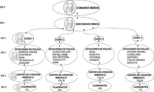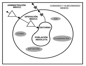 Los CAI y los cuadrantes (niveles de organización recursiva 4 y 5), como operadores primarios, encuentran funcional el modelo, debido al establecimiento de un esquema de comunicaciones que permite responder en tiempo real a necesidades y generar un entorno participativo. Así mismo, la MEBOG expresa que el modelo MNVCC es efectivo, dado que esta metodología de trabajo del servicio policial sí está dirigida a la caracterización de los diferentes tipos de violencia y criminalidad que afectan a la convivencia y seguridad de la población, y promueve su mejoramiento. El modelo realizado (Figura 9) presenta características que permiten determinar una organización funcional, en la cual sus actividades primarias son suficientemente autónomas e independientes para aumentar la operatividad y los resultados del modelo.