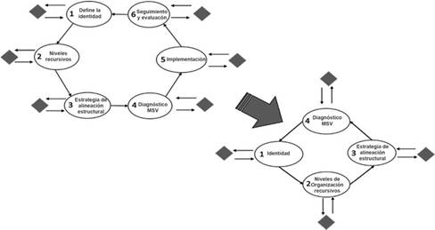 Las dos primeras etapas están destinadas a producir conjuntamente una rica estructura de la identidad organizacional y la interacción actual de la organización con su nicho; allí se acuerdan los límites del sistema de organización en estudio, lo que se conoce como "el sistema en foco". Las siguientes dos etapas, el diseño estructural y el diagnóstico, ayudan, desde el punto de vista del MSV, al aprendizaje de quienes participan en el ejercicio para mapear, analizar y decidir conjuntamente las mejoras estructurales que le permitirían a la organización superar sus principales barreras. La MAT sugiere técnicas y criterios analíticos para cada etapa, y algunos de ellos se pueden usar en modos de diagnóstico o diseño, sobre la producción de modelos de complejidad organizacional (Espinosa & Walker, 2017).