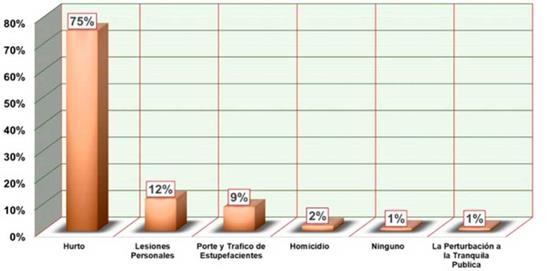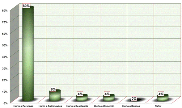 Para la pregunta 1, acerca de la necesidad de más policías en el cuadrante, se obtuvo como resultado que el 52 % considera que no. Es decir, según ellos, es suficiente la cantidad de operadores policiales dentro del cuadrante. Respecto a la pregunta 2, sobre si el tiempo de respuesta en zonas fronterizas de cuadrantes es mayor que en las demás zonas, el 73 % de los encuestados indican que no es mayor. Los resultados de la pregunta 3 (Figura 6) demuestran que, en los cuadrantes, el delito más frecuente es el hurto, con un 75 %, dentro del cual predomina el hurto a personas con un 80 % (Figura 7). De acuerdo con esto, se debe enfocar toda la atención al delito de hurto a personas, ya que este aumenta y perturba la percepción de inseguridad en la ciudad (Gélvez, 2018).