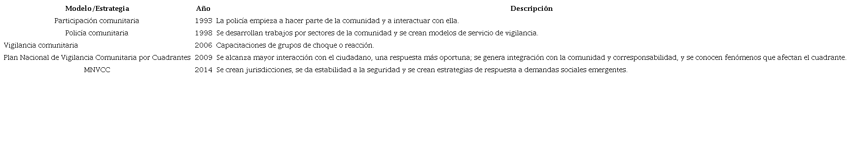 La historia del uso de cuadrantes o divisiones se remite al siglo XVIII, con estudios relacionales de zonas geográficas y tipos de delitos (Román, 2013). En este caso, los programas de seguridad ciudadana aplicados en Latinoamérica y el Caribe, principalmente en Colombia, cuentan con un recorrido institucional con reformas policiales que los hacen modelos a seguir en la región (Paez et al., 2018). En el año 1998, las principales ciudades de Colombia -como Bogotá, Cali, Barranquilla, Medellín, Cartagena, Cúcuta, Bucaramanga y Pereira- implementaron la seguridad por zonas a partir de una estrategia proveniente de España, específicamente de Barcelona, y que se denominó "Equipos de barrio". Posteriormente, la estrategia se extendió a más de 50 municipios (Ruiz, 2009). Este hecho es importante porque fue entonces cuando se estableció la seguridad por sectores, que más adelante pasarían a llamarse cuadrantes (Policía Nacional de Colombia, 2010). Una década más tarde, específicamente en el año 2009, el uso de cuadrantes fue diseñado y planeado en su totalidad en Bogotá por medio del Plan Nacional de Vigilancia Comunitaria por Cuadrantes (Ruiz & Páez, 2016). La estrategia fue el acercamiento a la comunidad y el control de la delincuencia mediante la restauración del carácter civilista de la policía, lo que permitió identificar actividades delictivas y violentas (Llorente et al., 2011; Román, 2013). Posteriormente, en el año 2014, se consolidó con el nombre de Modelo Nacional de Vigilancia Comunitaria por Cuadrantes (MNVCC) en todo el territorio colombiano (Policía Nacional de Colombia, 2014). La Tabla 1 muestra la evolución cronológica de los modelos de seguridad adoptados por la Policía Nacional.