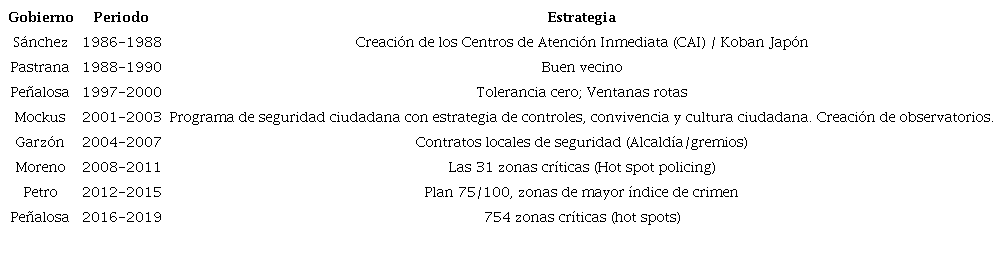 Sin embargo, bajo este contexto evolutivo de participación comunitaria implementado por la Policía Nacional de Colombia, donde las propuestas están dirigidas a brindar bienestar a las comunidades de forma que se promueva una mejor calidad de vida (Quintero, 2020), la estrategia de seguridad de cada gobierno distrital de la ciudad de Bogotá ha sido cambiante según sus políticas públicas (Tabla 2). Por esta razón, se ha dificultado la evaluación de resultados y el seguimiento del MNVCC.