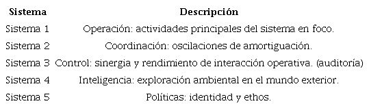 Beer comenzó por considerar dichos tres componentes en analogía con el organismo humano y su mundo, como tres partes principales que interactúan: cuerpo, cerebro y medioambiente (Espinosa & Walker, 2017), analizando el MSV en cinco sistemas: operación, coordinación, control, inteligencia y política. Así, es esencial que las funciones que cumple cada sistema se implementen de manera correcta en la organización.