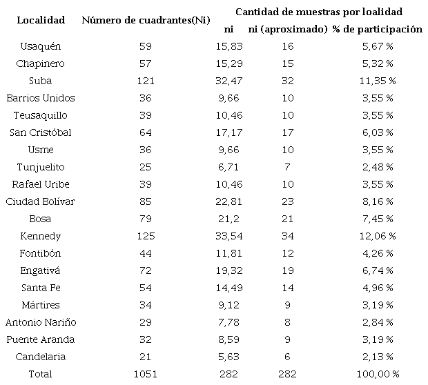 Así, tomando una población N= 1051, que son los cuadrantes determinados por la Policía Nacional para Bogotá; un nivel de confianza del 95 % que se normaliza en valor Z= 1,96; un margen de error e = 0,05, y asumiendo una desviación estándar de a = 0,5, se necesitaron 282 resultados de las encuestas en las 19 localidades. Posteriormente, para el cálculo de la muestra por localidades se usó la siguiente fórmula: