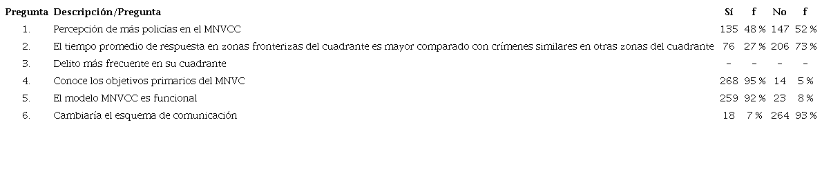 Posteriormente, en la pregunta 4 se observó que el 95 % de los encuestados conoce claramente los cinco objetivos primarios del modelo. Esto comprueba que existe un alto conocimiento de la identidad de este, lo que permite reconocer y ejercer las funciones para dar cumplimiento a dichos objetivos. Con respecto a la pregunta 5 sobre la funcionalidad del MNVCC, se tuvo una percepción positiva del 92 % frente a la funcionalidad de este en la MEBOG, lo que refleja el desempeño y la efectividad del programa. Por último, en la pregunta 6, el 93 % de los encuestados manifestó su apoyo al esquema de comunicación actual indicando que este no debería cambiarse. En este sentido, los operadores policiales perciben que el MNVCC funciona de forma efectiva, lo cual también se ve reflejado en los resultados positivos en reducción del crimen (Fundación Ideas para la Paz [FIP], 2012).