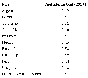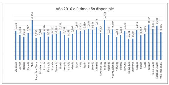 En el 2017, el coeficiente Gini para la mayoría de los países en la región está en promedio en cifras muy cercanas al 0,5 (Tabla 1), lo que ubica a Latinoamérica como una de las regiones más desiguales en el mundo en comparación con los datos de los países miembros de la OCDE, cuyo promedio para el 2016 y 2017 gira alrededor de 0,3 (Figura 1). Dicha desigualdad se puede explicar, en muchos casos, por la corrupción que permea las políticas redistributivas o, de acuerdo con Boyer (2007), por el grado de relevancia que tienen algunas formas institucionales en los modos de regulación y su incidencia en la repartición desigual de valor en la sociedad para el sostenimiento de algún tipo de régimen de acumulación vigente.