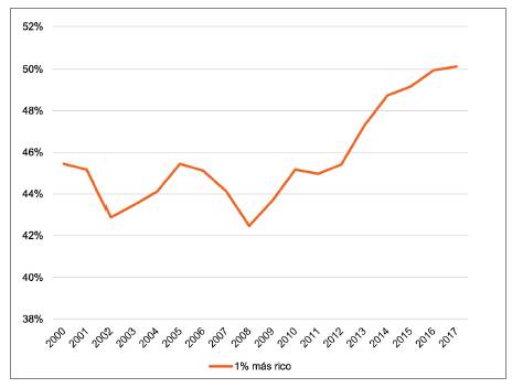La desigualdad se traduce en exceso de acumulación de riqueza para unos y desposesión y pobreza para otros. A nivel global, el exceso de acumulación ha llegado a tal punto que el 1 % de la población mundial posee más del 50 % de la riqueza total (Figura 2). Esto implica enormes desafíos para la economía moderna y sus formas de regular los procesos de acumulación.
