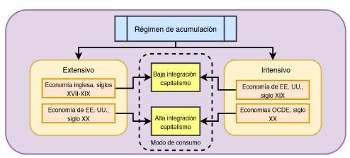 En la Figura 3 se puede observar la configuración de un régimen de acumulación. Este se da bajo dos parámetros: el carácter de acumulación y su modo de consumo. El carácter de acumulación de un régimen depende de la naturaleza de su dominación, que puede ser extensiva o intensiva. El carácter de acumulación extensivo implica conseguir la mayor cantidad de espacio posible sin importar el cambio de la técnica de producción; en cambio, el carácter intensivo de un régimen de acumulación depende exclusivamente de la innovación permanente orientada a obtener mayor productividad. El modo de consumo, integrado o no al capitalismo, es el que finalmente asegura la vigencia del régimen, pues son los asalariados los que aseguran una parte del consumo de la producción a un valor mucho mayor que el obtenido por su fuerza de trabajo (Boyer, 2007).