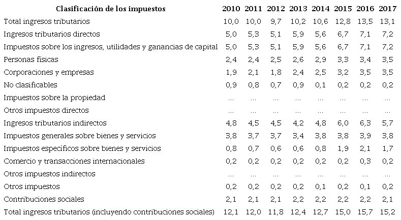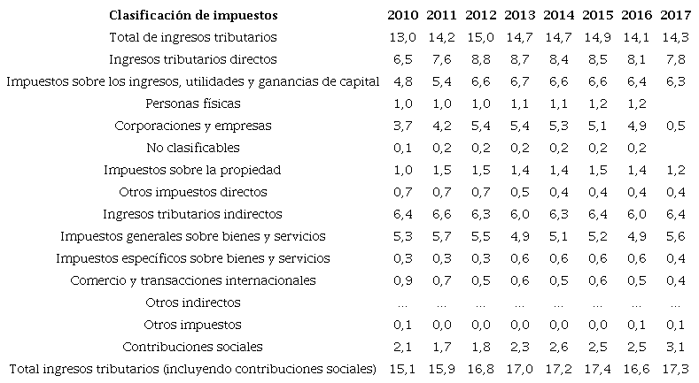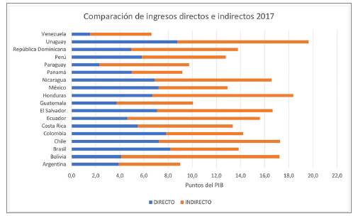 Para esta región se puede establecer un perfil de la estructura tributaria según lo mostrado en la Figura 5, en la que se observa notoriamente que la mayoría de los esquemas tributarios establecidos para la consecución de los ingresos es producto de impuestos de índole indirecto, que no gravan las rentas obtenidas por parte de los sujetos pasivos, sino la acción al consumo.
