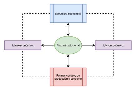 Por ello se necesitan nociones intermedias que establezcan la relación entre la estructura económica, las formas sociales y las condiciones políticas, y que determinen las particularidades de los sujetos inmersos en las dinámicas económicas. En la teoría de la regulación, estas nociones son conocidas como formas institucionales, que son "toda codificación de dos o más relaciones sociales fundamentales" (Boyer, 1992, p. 54), cuya importancia radica en que son susceptibles de ser analizadas empíricamente y permiten concebir un tránsito intrínseco de lo microeconómico a lo macroeconómico (Figura 8). Existen cinco formas institucionales o dominios de la teoría de la regulación que logran esbozar particularidades de las formas sociales y las regularidades económicas: la moneda, la relación salarial, la competencia, la adhesión a un régimen internacional y el Estado. Estas formas institucionales corresponden a instituciones ocultas que desde la teoría neoclásica son imperceptibles, excluidas o exógenas a los desarrollos de la teoría general de equilibrio en una economía de mercado, omitiendo hipótesis fundamentales como la dinámica histórica y la delimitación espacial.
