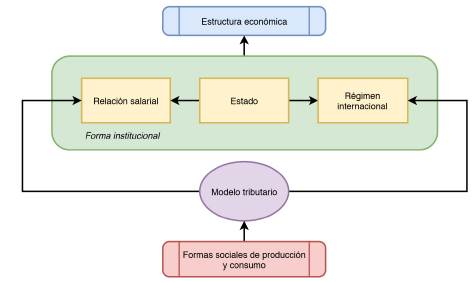 Así, en la teoría de la regulación francesa, las formas institucionales representan nociones intermedias que logran establecer relaciones entre las dinámicas sociales y las estructuras económicas, visibilizando factores sociales que antes no se tenían en cuenta en las percepciones de análisis para la comprensión de muchos fenómenos económicos. La relación salarial, la adhesión a un régimen internacional y el Estado representan un importante avance en el entendimiento de muchas decisiones en economía política y geopolítica. A su vez, los modelos de tributación tienen un grado de incidencia en la canalización de estas formas (Figura 9), dado que afectan la capacidad de consumo y riqueza (salario); el nivel de equidad y desigualdad (adhesión a un régimen internacional), y la política económica para el funcionamiento de las naciones (Estado).