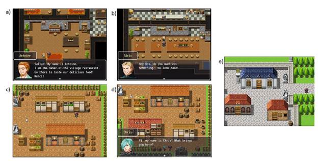 El pueblo, el entorno virtual en el que se desarrolla el juego, se muestra parcialmente en la Figura 2. Este tiene una parte central donde se ubican el banco, la joyería, la herrería y la tienda de pociones, y otra parte es el barrio, donde están las casas de otros personajes y el restaurante.
