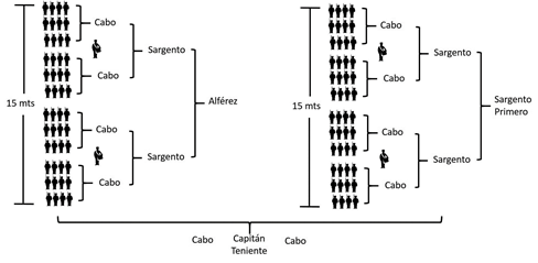 Para que los cuerpos militares pudieran funcionar de manera operativa y eficiente, se necesitaba una cadena de mando para impartir órdenes y un despliegue disciplinado de los hombres para poder formar, marchar y desplazarse tanto en el campo de batalla como a lo largo de los trayectos de campaña. Para el caso de la infantería, las compañías se dividían como se muestra en la Figura 2, marchando al sonar de un tambor o pífano, en columna paralela, y ocupando un espacio en profundidad de 15 metros.