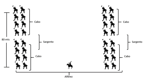 La compañía, compuesta por 110 hombres y comandadas principalmente por el capitán, era la quinta parte del batallón de infantería. Para que el batallón se mantuviera ordenado y organizado, se formaba en una disposición de 175 metros en ancho frente. Hay que tener en cuenta que las tácticas decimonónicas y el uso de armas como los fusiles Springfield y Bess Brown, las carabinas, los rifles Baker, las espadas y sables, entre otros, obligaban a los ejércitos a tener unas formaciones específicas. En el caso de la caballería, cada escuadra estaba organizada con 8 soldados montados comandados por un cabo. Las 4 escuadras sumaban un total de 32 jinetes, conformando un pelotón. Así, dos pelotones eran 64 jinetes comandados por 14 cuadros, lo que componía una compañía de 78 hombres montados. El escuadrón de caballería, que era la unión de dos compañías, estaba conformado por 156 jinetes comandados por un coronel. En la Figura 3 se ve un pelotón de caballería organizado en columna paralela y ocupando 80 metros en profundidad.