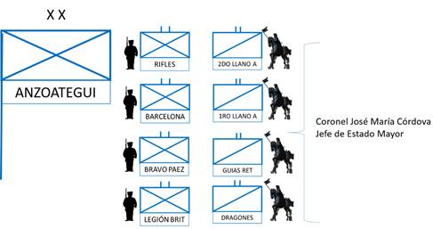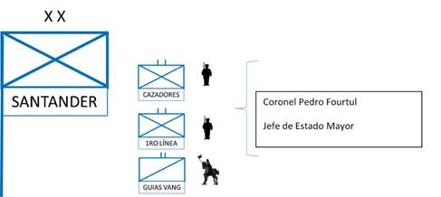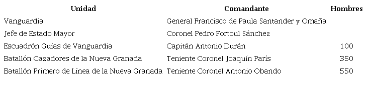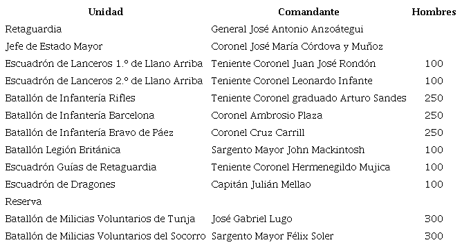 De acuerdo con esta organización, se encuentra que el Ejército Libertador estaba bajo el mando del General Simón Bolívar, cuyo Jefe de Estado Mayor era el General Carlos Soublette. Las tropas estaban organizadas en una vanguardia (Tabla 1 y Figura 4) y una retaguardia (Tabla 2 y Figura 5) dirigida por sus respectivos comandantes.