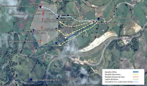 Además, se estudió la información recolectada y se hizo un análisis de la simbología militar universal (Ejército Nacional de Colombia, 2003) empleada por los historiadores militares, en aras de comprender la organización social y táctica de los ejércitos que participaron en la batalla. Con base en los análisis simbológicos y de archivo, se confrontaron los datos con el terreno y la teoría de la guerra de la primera mitad del siglo XIX. Para ello se utilizaron las cartas geográficas y el software Google Earth, y se georreferenciaron las unidades militares dentro de los territorios aledaños al río Teatinos, con lo cual se ubicaron las coordenadas en que posiblemente se posicionaron los actores de esta batalla durante su desarrollo.