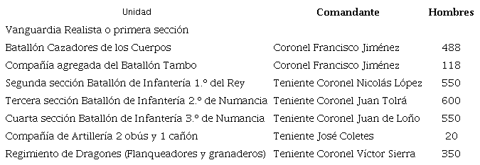 En cuanto al Ejército Realista, este se encontraba bajo el mando del Coronel José María Barreiro Manjón, cuyo Jefe de Estado Mayor era el Teniente Coronel Sebastián Díaz. Las tropas del Ejército Realista estaban organizadas en cuatro secciones, un regimiento de dragones y una compañía de artillería (Tabla 3 y Figura 6).