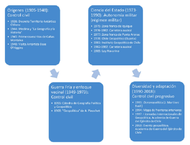 En relación con sus orígenes, préstamos intelectuales y desarrollo, de la geopolítica chilena no se puede desprender una Escuela Geopolítica con mayúsculas, pero sí se puede hablar de un desarrollo conceptual que sigue una cierta lógica, por lo menos hasta la década de los 2000, cuando empieza a recibir enfoques críticos. Desde luego, su evolución está conectada con variables de contexto, representantes, temas, textos, naturaleza terrestre o marítima, su relación con el pensamiento civil y el escenario de control civil o autonomía militar. Ha sido más destacada en ciertas coyunturas, como el conflicto chileno-argentino, en buena parte del siglo XX; las administraciones del Partido Radical, muy cercanas a Cañas Montalva; o el golpe de 1973 y el ascenso de Pinochet que puso la geopolítica como preocupación. Tras los años noventa, cambió la coyuntura internacional, surgió la Globalización, se produjeron procesos intensos de integración entre Brasil y Argentina, se debilitó la percepción de Argentina como rival y, al mismo tiempo, hubo reajustes académicos en el enfoque geopolítico que los militares advierten y asimilan gradualmente. Es el momento de una geopolítica integracionista, y de volver a la preocupación por el poblamiento y la conexión de un país de miles de kilómetros y periferias despobladas.