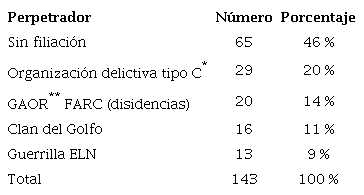 Entre enero de 2016 y mayo de 2019, la FGN (2019) priorizó la investigación de 277 homicidios cometidos contra defensores de DD. HH. y líderes sociales, políticos y comunales que fueron reportados y verificados por la Oficina del Alto Comisionado de las Naciones Unidas. La investigación arrojó avances significativos en 161 casos (58 %), en los que se vincularon 411 personas, de las cuales 247 fueron privadas de la libertad. A partir de 32 sentencias, 54 casos en juicio y 32 indagaciones con orden de captura, la FGN estableció y caracterizó a los perpetradores de 143 homicidios como se muestra en la Tabla 1.