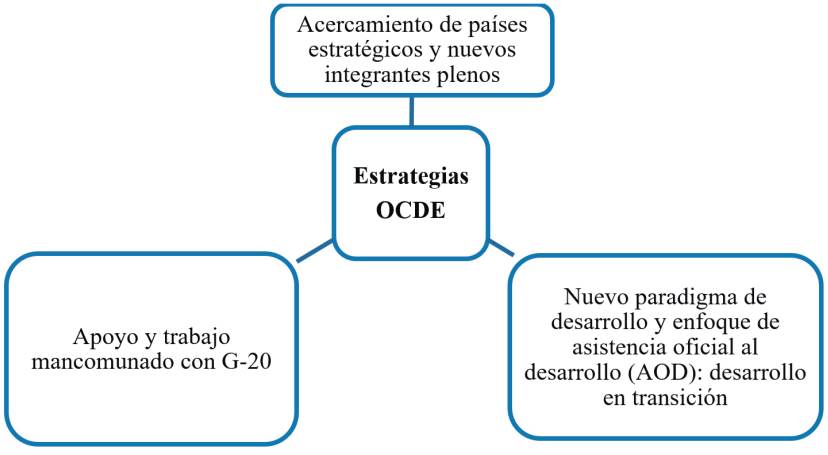 Para este análisis se identificaron las tres estrategias antes introducidas, con las cuales la OCDE en los últimos años ha buscado sumar relevancia en los asuntos y en la agenda de gobernanza económica mundial: 1) el acercamiento a Estados considerados estratégicos y ampliación de los miembros plenos; 2) el trabajo complementario y cooperativo con el G-20, y 3) la introducción de un nuevo paradigma de desarrollo y de cooperación internacional: “desarrollo en transición” (Figura 1).