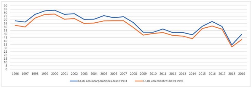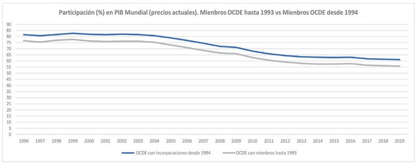 La Figura 2 presenta una comparación de la participación en la economía mundial de los miembros originarios de la OCDE junto con las incorporaciones que hicieron hasta 1973 0apón, Finlandia, Australia y Nueva Zelanda), por una parte, respecto a su participación, por otra parte, con los Estados que se incorporaron desde 1994 hasta 2018 (México, República Checa, Hungría, Polonia, Corea del Sur, Eslovaquia, Chile, Eslovenia, Israel, Estonia, Letonia, Lituania). Como se puede ver, con estas adiciones ha logrado una participación cercana al 62% para 2019.