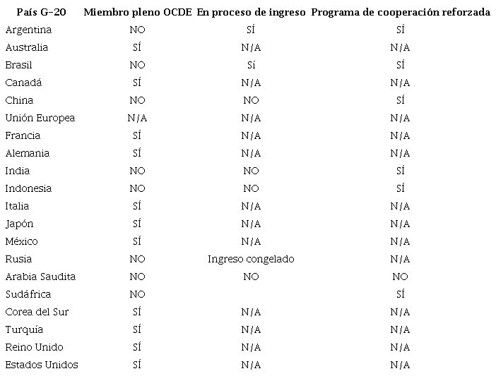 Como se puede apreciar en la Tabla 1, existe una considerable coincidencia entre los miembros del G-20 y la OCDE. De los 19 Estados, excluyendo a la Unión Europea (UE), que hacen parte del G-20, 11 (58 %) también integran la OCDE. Con los eventuales ingresos de Argentina y Brasil, el porcentaje de coincidencia llegará al 68 %. Por otra parte, con los restantes integrantes del G-20 que actualmente no se encuentran en proceso de adhesión (China, India, Indonesia, Sudáfrica y Rusia, con su proceso congelado) existen diferentes programas de cooperación reforzada, y estos Estados participan en comités y espacios de la organización.