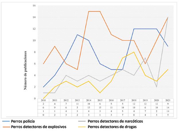De acuerdo con los datos presentados, se observa un crecimiento de la producción científica relacionada con el uso de caninos en labores de defensa y seguridad. Sin embargo, la modesta cantidad de documentos sugiere que se requiere mayor esfuerzo para incorporar más investigadores a este tipo de temas tan relevantes para la soberanía nacional. Asimismo, resulta notorio el interés por estudiar la detección de explosivos empleando caninos, dado que esta línea fue la que obtuvo un mayor número de artículos en el periodo analizado. En este sentido, este artículo busca contribuir a dicho propósito, a fin de generar espacios de discusión y conocimiento sobre el uso de las fuerzas caninas en la seguridad y la defensa nacional.