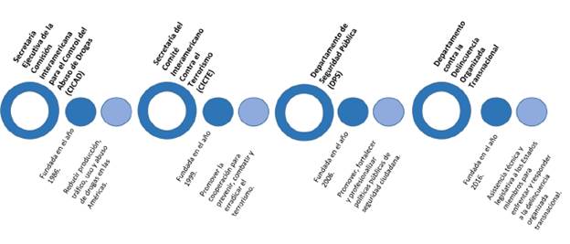 Así las cosas, orientada bajo el eje de la seguridad multidimensional, la Organización de Estados Americanos (OEA) (2021a) tiene la responsabilidad de garantizar la protección de las naciones americanas, labor que lleva a cabo a través de la figura de la Secretaría de Seguridad Multidimensional (SSM). Por medio de la SSM, se trabaja por robustecer la colaboración entre los países miembros, el avance en políticas para la región, al igual que la formulación de mecanismos que les permitan afrontar las amenazas existentes. Por otra parte, cabe recalcar que la SSM rige su actuación según los parámetros establecidos en la Declaración sobre Seguridad de las Américas, fundamentada en la Carta de las Naciones Unidas y la Carta de la OEA. Dicha declaración establece un conjunto de valores compartidos, así como enfoques comunes para combatir "las amenazas tradicionales, las nuevas amenazas, las preocupaciones y otros desafíos que confronta nuestro hemisferio" (OEA, 2003).