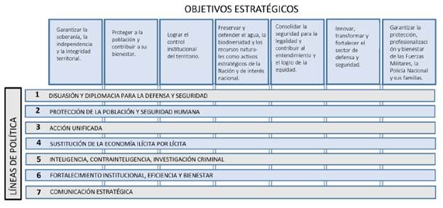 Tomando como insumo principal el uso de caninos como apoyo táctico u operacional dentro de las Fuerzas Armadas en Colombia y el papel que se les ha delegado hoy en día, como elemento de gran valor en el modelo de seguridad multidimensional, es oportuno hacer una evaluación detallada de la estructura de la Política de Defensa y Seguridad (MinDefensa, 2019), para analizar los objetivos estratégicos y específicamente las líneas de política, con el ánimo de proponer nuevos lineamientos que puedan integrar el uso de equipos caninos en sus acciones. Cabe destacar que las siete líneas de política establecidas por el Gobierno nacional plantean un esquema de trabajo transversal para los objetivos estratégicos definidos y, a su vez, cada línea está compuesta por diez acciones específicas. No obstante, los lineamientos que se proponen estarán dirigidos a combatir los puntos focales en términos de seguridad y defensa donde los perros pueden ser efectivamente utilizados.