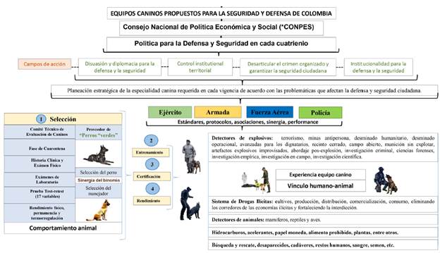 Para concluir, la participación de los equipos caninos en seguridad y defensa debe planearse de acuerdo con el documento establecido en el Consejo Nacional de Política Económica y Social (CONPES), como máxima autoridad de planeación que asesora al Gobierno nacional en todos los aspectos que se relacionan con el desarrollo económico y social del país, dentro de los cuatro campos de acción relacionados (Figura 5).