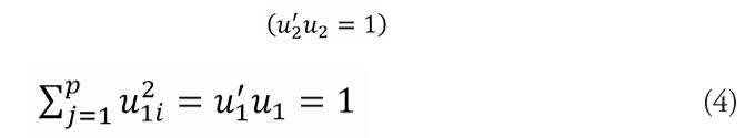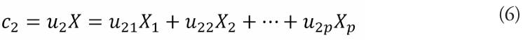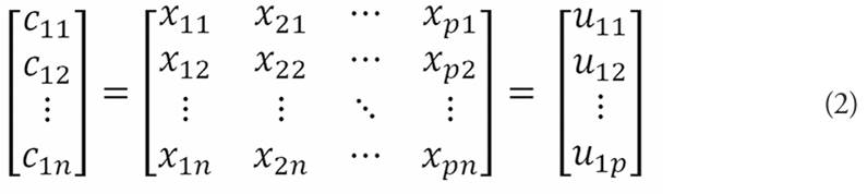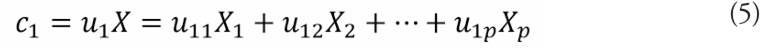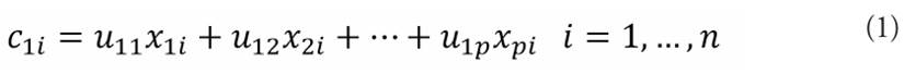 Donde los pesos o ponderaciones (vector u1i ) expresan las contribuciones de las variables originales a las nuevas dimensiones o componentes. Para el conjunto de n observaciones muéstrales y para todas las componentes se tiene: