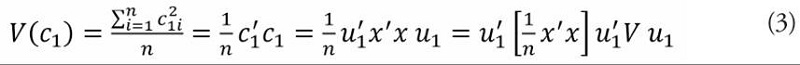 Donde, para maximizar la varianza de la primera componente, V(c1), se toma el mayor valor propio de la matriz . Considerando λ1 el mayor valor propio de V y tomando u1 como su vector propio normalizado (u’1u1=1)> se obtiene la primera componente principal, cuya ecuación está dada por: