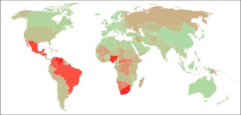 En la Figura 1 se presenta el comportamiento de la tasa de homicidios incluida en la base de datos del Informe de Desarrollo Sostenible 2021 (Sachs et al., 2021). Se observa que en países como Australia (AUS), Nueva Zelanda (NZL), Indonesia (IDN), Japón (JPN), Senegal (SEN), Canadá (CAN), Argentina (ARG), Chile (CHL), Ecuador (ECU), Perú (PER), Paraguay (PRY), Estados Unidos (USA), Rusia (RUS), gran parte de Asia y la Unión Europea, actualmente se registran bajos niveles de homicidios. Sin embargo, aunque la meta de los ODS a nivel global es que este indicador se reduzca considerablemente hacia el año 2030, aún existen países que afrontan retos al respecto. En el mapa se puede visualizar la situación que están afrontando países como Honduras (HND), Venezuela (VEN), Jamaica (JAM), México (MEX), Haití (HTI), Nicaragua (NIC), Colombia (COL), Brasil (BRA), Nigeria (NGA) y Sudáfrica (ZAF), donde se presentan las tasas más altas de homicidios en el mundo.