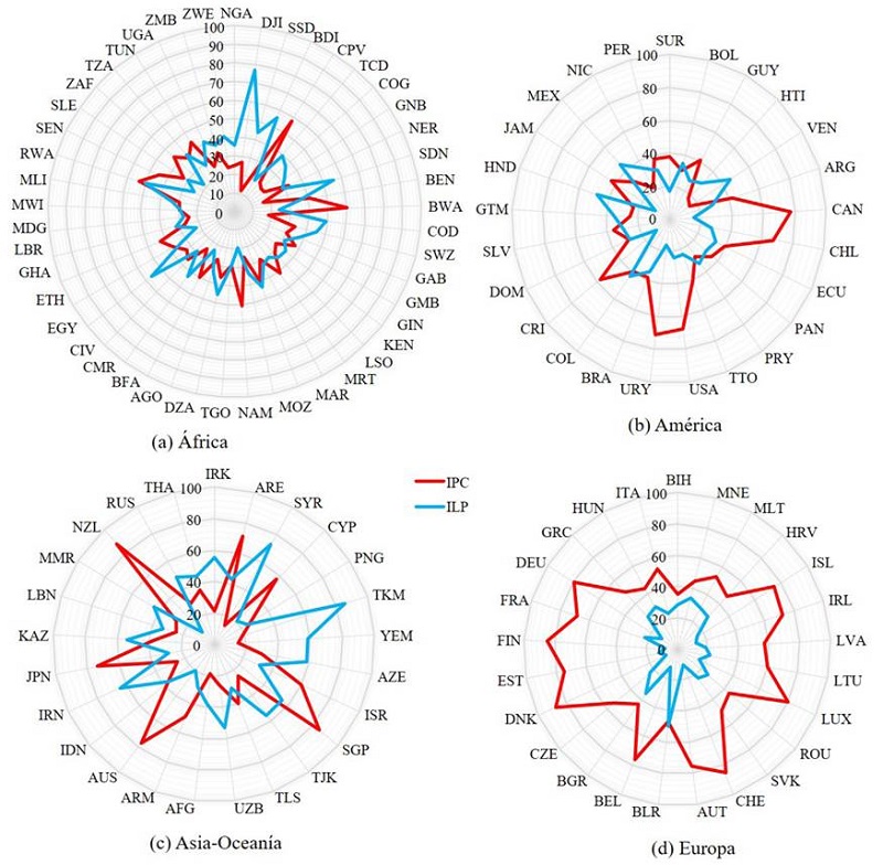 En la región de las Américas (Figura 2b), Venezuela (VEN) registra el indicador de corrupción más crítico, seguido de Nicaragua (NIC), México (MEX), y Honduras (HND), que también presentan bajas puntuaciones en el ILP. En contraste, se observa a Canadá (CAN), Estados Unidos (USA) y Uruguay (URY) con las mejores puntuaciones de la región. En Asia y Oceanía (Figura 2c), países como Turkmenistán (TKM), Siria (SYR) e Irak (IRK), presentan valores críticos en el IPC. En lo que tiene que ver con el ILP, cabe resaltar que Nueva Zelanda (NZL) es uno de los países menos corruptos del mundo y presenta el mejor puntaje de ILP del continente, aun por encima de Australia (AUS), Japón (JPN), Singapur (SGP), Emiratos Árabes (ARE) y Chipre (CYP).