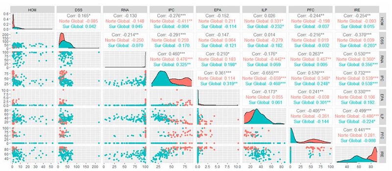 Para continuar con el análisis, en la Figura 3 se presenta la matriz de correlaciones entre todos los pares de indicadores analizados, diferenciando por colores la clasificación de los países según si pertenecen al sur o al norte global. En el triángulo superior de la matriz, el primer valor mostrado corresponde a la correlación de Pearson calculada para todos los países, sin hacer distinciones por regiones; y los siguientes valores se refieren a las correlaciones calculadas entre los países de cada región.