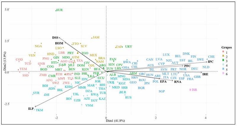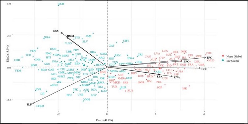 Para interpretar las representaciones gráficas (Biplot) obtenidas, en la Figura 4 se presenta el plano con los resultados de los dos primeros ejes de reducción de la dimensionalidad. En el plano que contiene la información de las componentes 1-2 del análisis PCA, la variabilidad acumulada es del 55,7 % y se distinguen por colores los países según su pertenencia al norte (color rosa) o al sur global (color azul). En cuanto a los indicadores analizados, debe tenerse en cuenta el tamaño del ángulo entre los vectores representados, ya que, entre más pequeños sean, mayor es la covariación entre las variables de interés. Por ejemplo, se observa que los índices HOM y DSS son indicadores con alta covariación directa y se ubican en dirección contraria al eje 1 (hacia la izquierda).