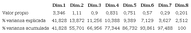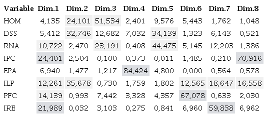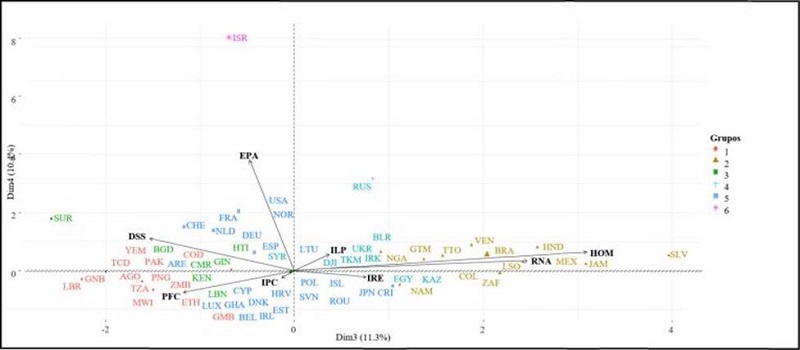 En la Tabla 4 se presentan las ponderaciones de las variables a estas dimensiones (o ejes) de reducción de la dimensionalidad. Es posible notar cómo las variables que más contribuyen a la primera dimensión son los índices de percepción de la corrupción (IPC) y el de rendimiento estadístico (IRE), además del puntaje de paraíso fiscal corporativo (PFC). En cuanto a la componente 2, se exaltan las ponderaciones de las siguientes variables: homicidios (HOM), índice de libertad de prensa (ILP) y detenidos sin sentencia (DSS). También se observa el indicador HOM como característico del eje (o dimensión) 3, junto con el registro civil de menores de 5 años (RNA) y el EPA, que contribuyen a la dimensión 4.