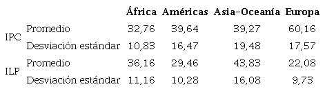 En lo que respecta a Europa (Figura 2d), la mayoría de países reflejan buenos puntajes para ambos indicadores, y Dinamarca (DNK) es el más sobresaliente de todos, seguido de Suiza (CHE), Suecia (SWE), Noruega (ÑOR), Países Bajos (NLD), Finlandia (FIN), entre otros. Sin embargo, al observar la Figura 2, es notorio que no todas las regiones mantienen la misma variabilidad, ni la misma media entre sus indicadores. Por lo tanto, en la Tabla 2 se resumen las medias y desviaciones estándar calculadas por regiones.