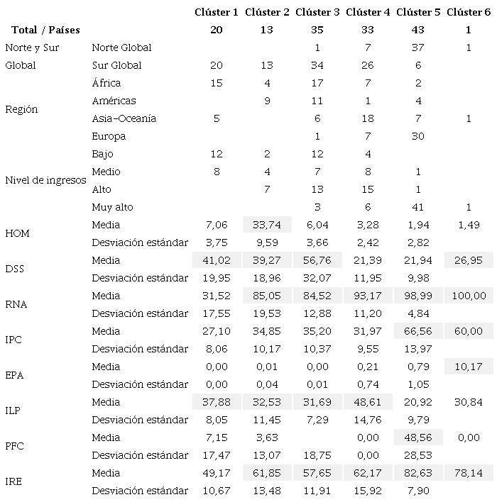 Para resumir las características de cada clúster identificado, en la Tabla 5 se presenta el total de países clasificados y las estadísticas descriptivas básicas (las medias y desviaciones estándar de cada indicador analizado) por clústeres o grupos. Mediante las cifras presentadas en esta tabla, es posible notar cómo los países del norte global tienden a pertenecer al clúster 5, mientras los del sur global se distribuyen entre los demás grupos.