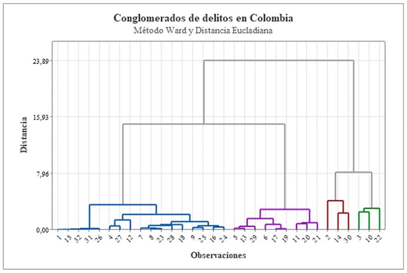 Así pues, teniendo en cuenta las corridas junto con los niveles de distancia y de semejanza entre variables, se dividieron los departamentos por los grupos característicos más cercanos entre sí, como se observan en el dendograma (Figura 1), que estableció los cuatro conglomerados o clústeres de los diferentes delitos clasificados en las diferentes regiones de Colombia. De este modo se pudieron reconocer los perfiles y sectores con mayor o menor impacto de delitos de violencia en el país.