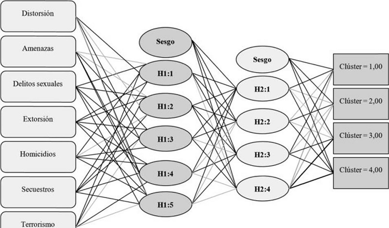 Con el fin de establecer un modelo para pronosticar los perfiles de violencia, en este apartado se desarrolló el procedimiento para implementar una red neuronal. Para iniciar, se precisaron los nodos de entrada y salida. De este modo, se procedió a establecer una estructura de inteligencia artificial, concebida mediante una red neuronal de doble capa. Para establecerla, se tomaron como punto de partida los cuatro clústeres, señalados en la Tabla 5. A su vez, como variables independientes se procesaron los clústeres identificados en el apartado anterior, además, como covariables se tuvieron en cuenta los diferentes delitos analizados. Finalmente, la estructura del modelo establecido trabajó como capa de entrada un modelo de tangente hiperbólica para ingresar los patrones que se comunican a la red neuronal, mientras que las capas ocultas dieron como resultado la capa de salida, empleando para esta el modelo sigmoide. Como función de error se utilizó la suma de cuadrados.