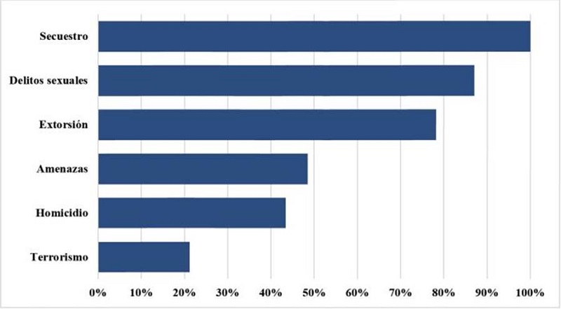 Así, las amenazas se consideran delitos que atemorizan a personas, instituciones, entidades o familias con el fin de propagar terror o coaccionarlas; los delitos sexuales son actos carnales abusivos y violentos; los delitos de extorsión son un acto de opresión y de obligación a tolerar o pasar por alto hechos, palabras y órdenes con el propósito de recibir beneficios para sí mismo o terceros. Por otra parte, los homicidios son delitos que atenían contra la vida de una persona, ya sea homicidio culposo, preterintencional o por piedad; a su vez, los delitos de secuestro se refieren a actos de privación de la libertad por retener, arrebatar o sustraer a una persona, ya sea secuestro simple o extorsivo. Por último, el terrorismo procesa aquellos actos de conflicto armado en el que estén implicados ataques de violencia hacia la población.